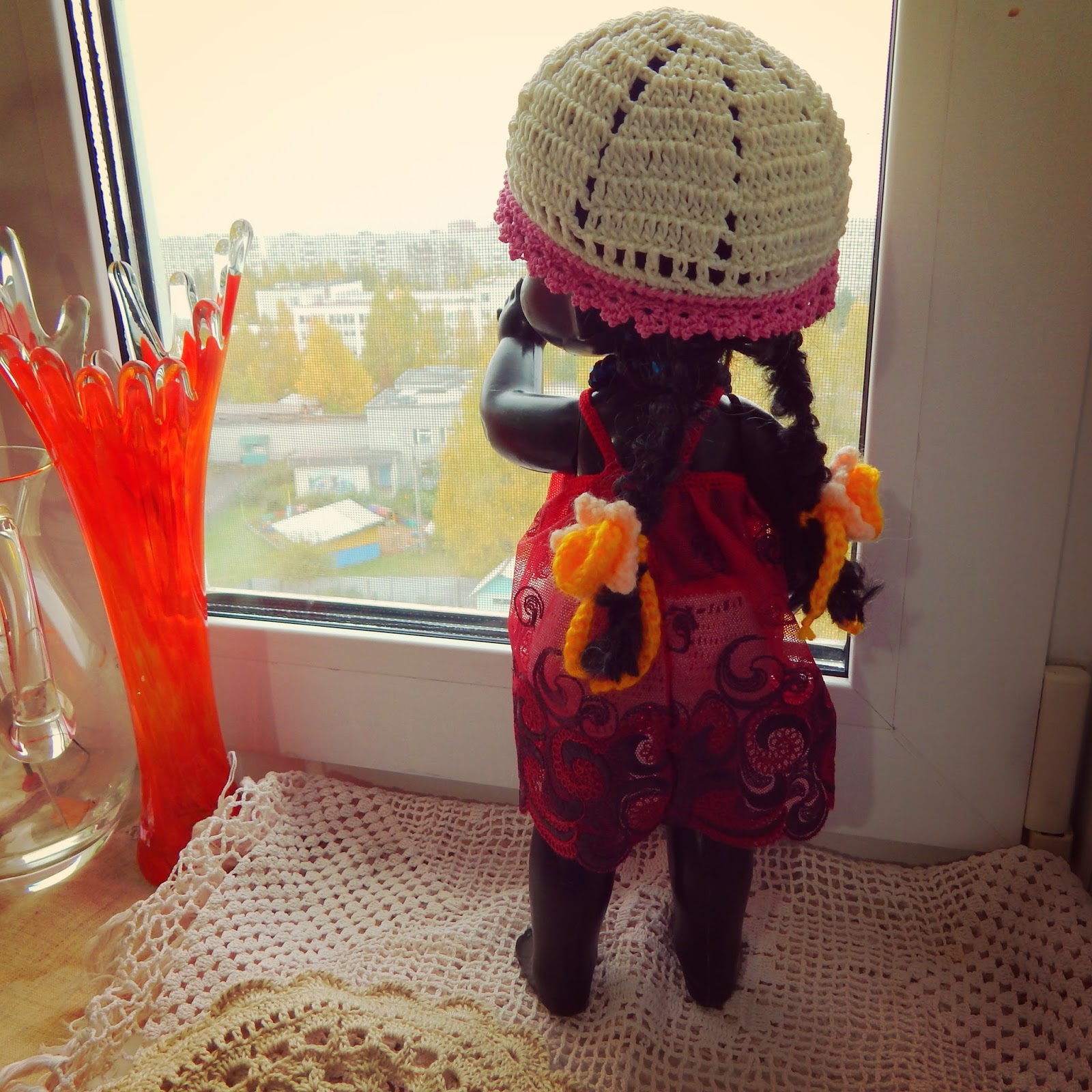 Платьице и шапочка Абанги появились совершенно случайно (хотела сначала одеть ее по другому), так как на винтажную салфеточку мне не хватило одного мотка пряжи "Орион" от Виты, то пришлось купить второй(. Из этого второго мотка было решено вязать платье и шапочку Абанге)