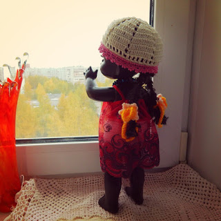 Шапочка для Абанги - это скорее необходимость, чем элемент одежды, волосы ее склонны к выпадению и наверно в будущем следует как-то укрепить ее прическу или заняться перепрошивкой. А пока для сохранности волос я заплела их в косы (с помощью черной пряжи), а к косам связала завязочки))) Ну и, конечно, не забыли одеть шапочку)))