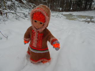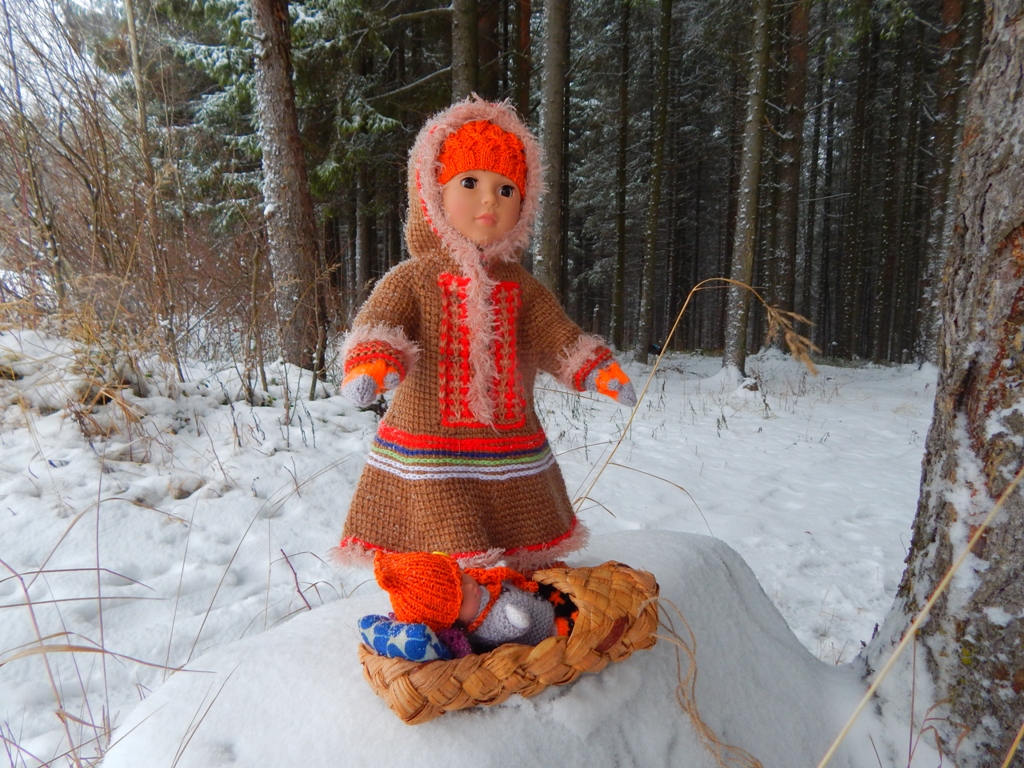 Мне нужно до середины декабря одеть большую куклу Алису (фабрика игрушек "Весна") в вязаный зимний костюм. Я решила связать Алисе малицу (верхняя одежда из оленьего меха у народов севера). Малицу я уже связала. А так как кукла Алиса живет теперь не у меня дома, то в фотосессии вместо Алисы приняла участие куколка Салли. Мне кажется, что Салли справилась на отлично, у Алисы бы так не получилось)))