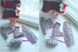 Пальто и сумочку я вязала тунисским крючком (пряжа Беби Ализе Шекерим, 100г/320м, 100% акрил). Для сумочки крючком связала небольшую морковку)))